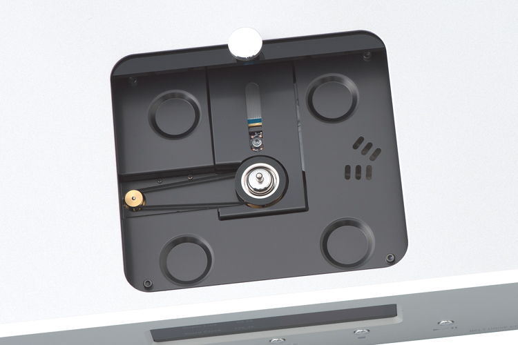 この問題を解決するために採用した独自のベルトドライブ方式では、重量級CDスタビライザーの使用によってターンテーブルの質量を上げ、慣性の力を利用することで極めて滑らかで安定したディスクの回転を得ることができました。そのぶんモーターを小さくし、ディスクの回転軸から離れた位置に配し、遠くからベルトで駆動することで振動も吸収することができるため、音楽信号を安定かつ正確に読み取り伝送する理想的な環境を創りだすことができたのです。さらに、レーザーピックアップを動かすモーターも同様にノイズ源と考え、距離を置いてベルトで間接的に駆動する、ダブルベルトドライブ方式としました。また、いつでもディスク駆動用ベルトの状態を確認したり、容易に交換できる構造を採用しました。