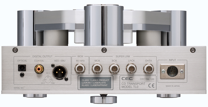 デジタル出力は、独自のSUPERLINKをはじめ、AES/EBU(XLR)、COAXIAL (RCA)、TOSLINK(角型光)の4系統を備えています。特に、CECの対応するD/Aコンバーターのマスタークロックを共用し、音楽信号と信号識別のためのクロックを独立に伝送、原理的にエンコード/ デコードに伴うジッターの発生を極限まで減らすことのできるSUPERLINK は、75ΩのBNCケーブルを4本独立に使用する方式を採用。CDに刻まれた情報を精確に細大漏らさず伝えるというCDトランスポート本来の役割にさらなる磨きをかけました。
